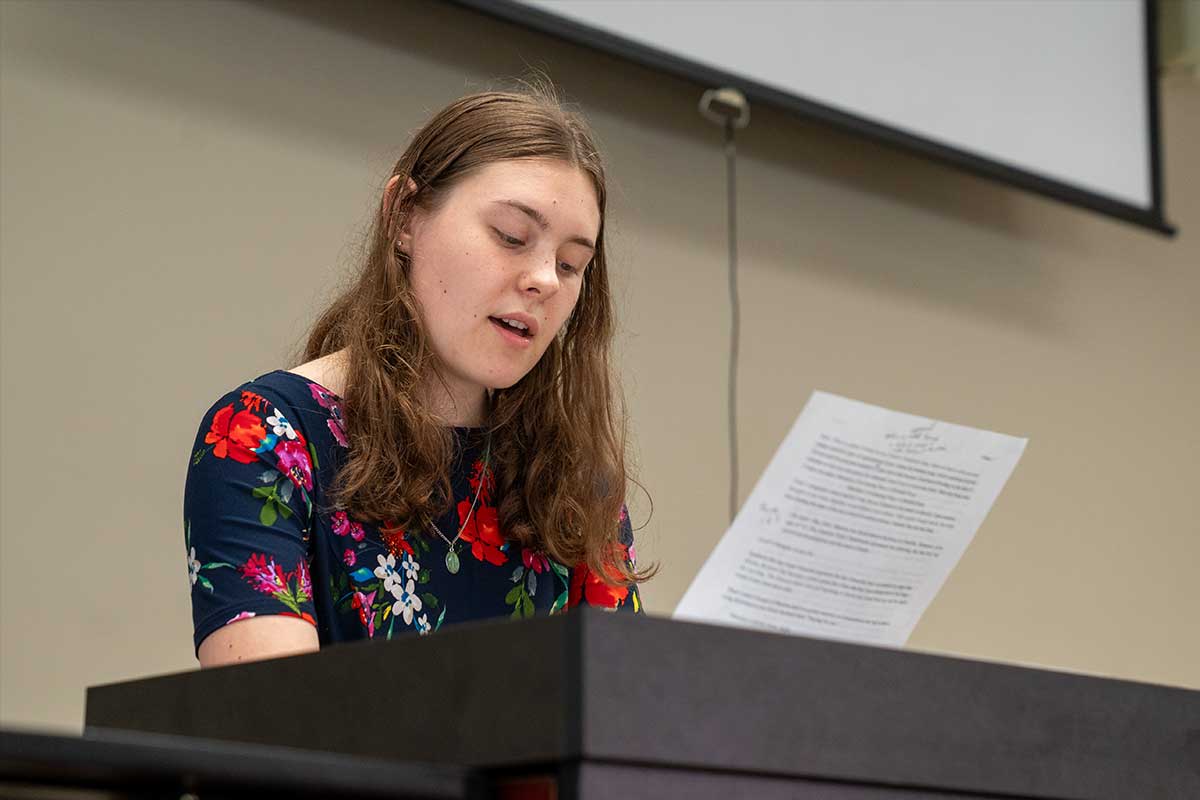 Alpha Chi Iota members gain leadership skills through serving as chapter officers, organizing poetry readings, and publishing the SAMPLER, the college’s annual student literary magazine. Many are also members and/or leaders of the Aquinas Writers’ Guild, a student organization which hosts open mic nights, creative writing activities, or trips to local bookstores.