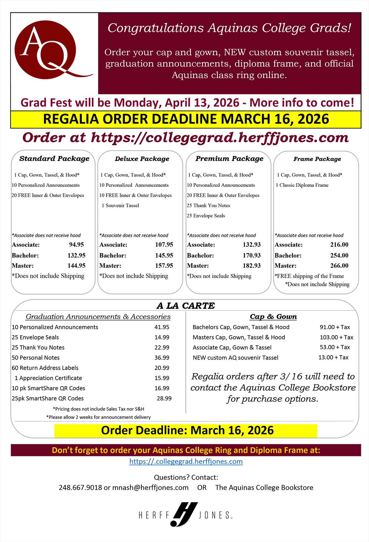 For questions about your order, contact Herff Jones at (248) 667-9018 / mnash@herffjones.com or contact the AQ Bookstore at (616) 632-2962 / aquinas@bkstr.com.