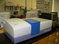 This spectrometer operates in the ultraviolet and visible regions of the spectrum. It has two main modes. In one mode, the amount of light absorbed by a sample is measured over a range of wavelengths, producing a graph known as an absorption spectrum, which can provide information about the structure of molecules in the sample solution. In the other mode, the light absorbed by a sample is measured at a single wavelength and compared to standards with known concentration in order to determine the concentration of one component of the sample. Both modes are used routinely in chemistry courses and this type of spectrometer is one of the first that students will learn to use. This instrument was purchased new in 2008 with funding from the Science Initiative. It also has an attachment that allows the temperature of the sample to be adjusted during measurement.